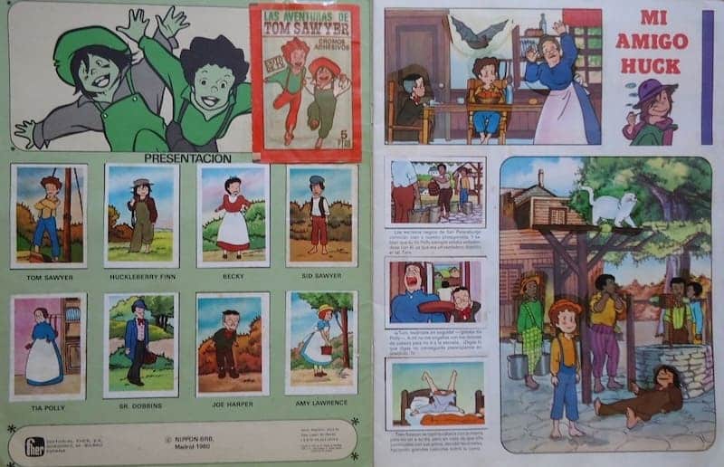 Sin duda, el objeto más recordado es el álbum de cromos editado por Fher en 1980. Con un total de 225 cromos, el álbum permitía a los niños seguir la historia de los 49 episodios de forma física. Las imágenes, extraídas directamente de los fotogramas del anime, mostraban escenas icónicas como el juicio de Muff Potter, el descubrimiento del tesoro de Joe el Indio o la escena de la cueva. Este álbum se convirtió en el principal motor de socialización en los colegios españoles durante el curso 1980-1981.